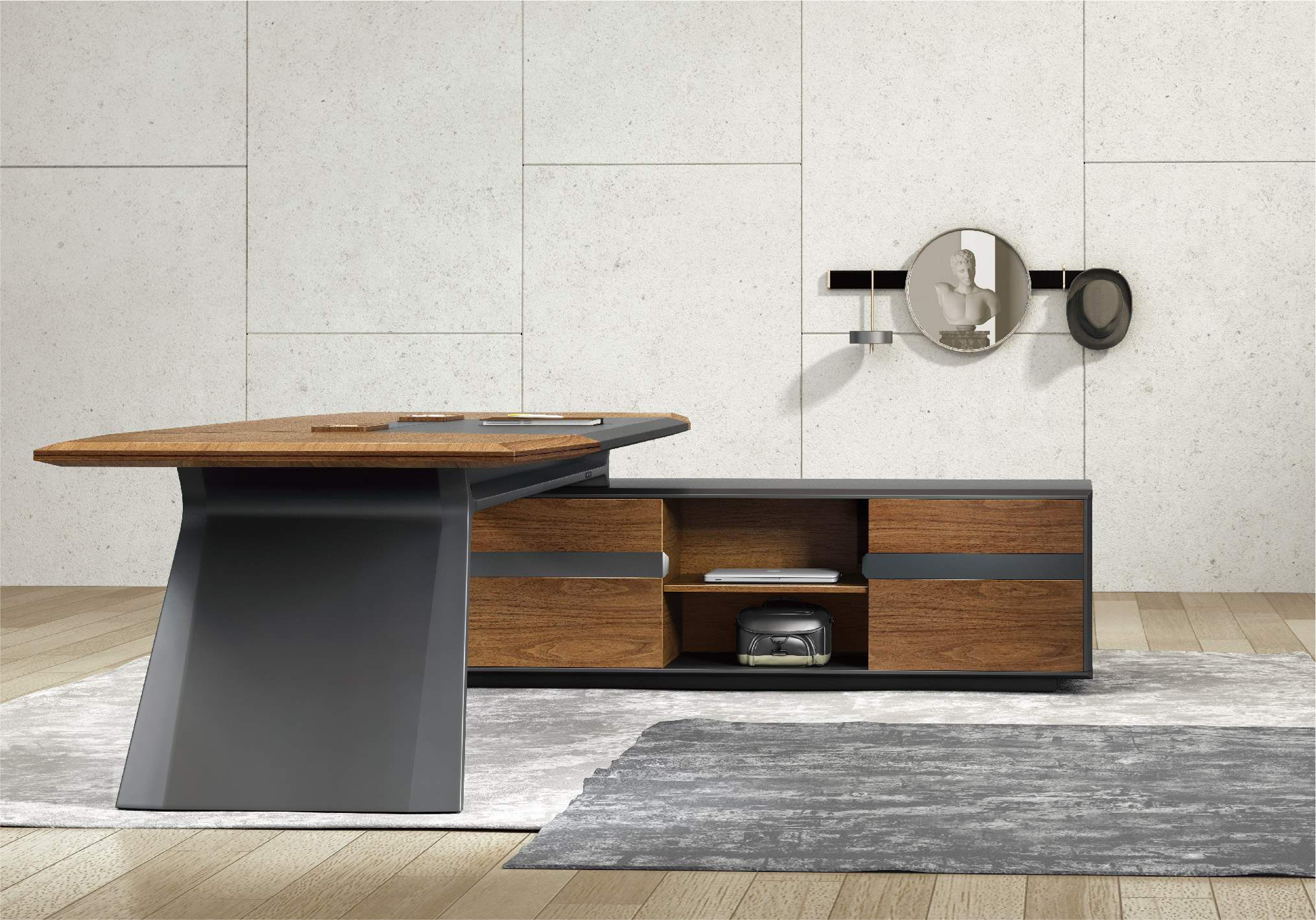 • Comprehensive Suite: Includes executive desks (left or right configurations), storage cabinets, and complementary meeting tables.